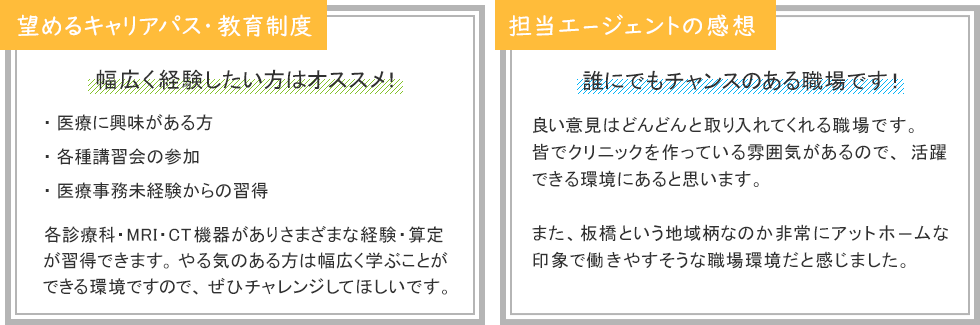 ーまずは受付会計で患者さんやスタッフとのコミュニケーションをとってクリニックの空気を知ってもらう形ですね。ちなみに教育制度はありますか。